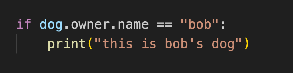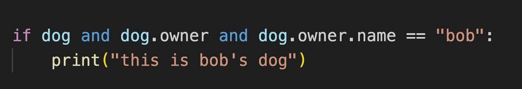- 如果我們沒有任何 None 值,dog.owner.name 會成功被存取,並用於與字串 “bob” 進行比較