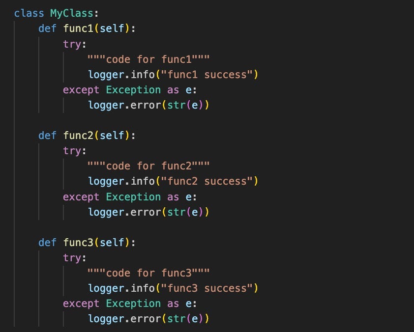 這是一個包含 3 個函式的類別,每個函式執行不同的操作。然而,請注意,不同函式之間存在相似的步驟——try-except 區塊以及日誌功能。