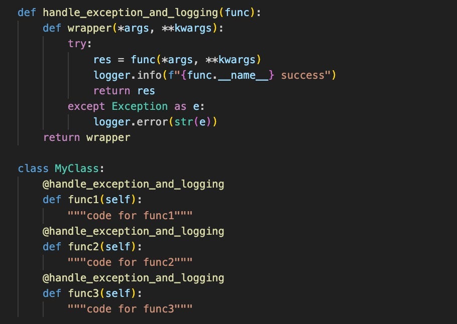 這樣一來,如果我們想要更新共用程式碼(try-except 和 logging 程式碼),我們不再需要在三個地方進行更新——我們只需要更新包含共用功能的裝飾器程式碼。